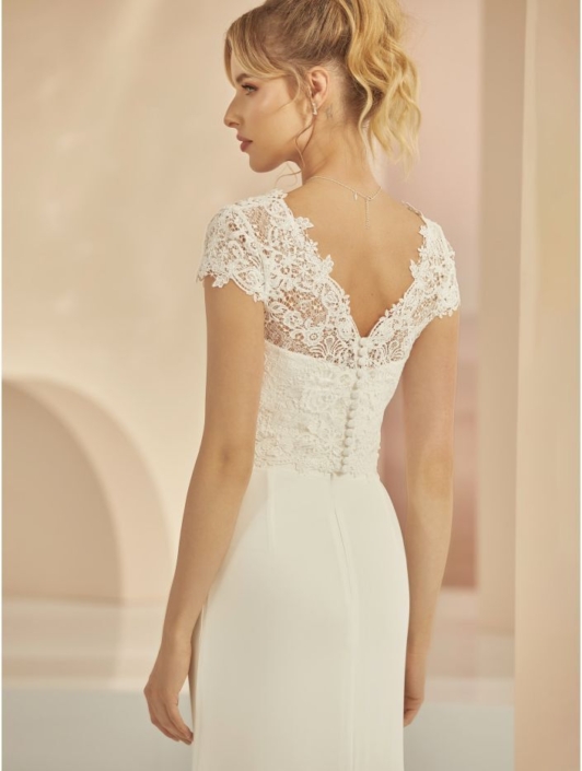 spannende Highlights. Ein Brautkleid-Zweiteiler aus Satin und Spitze vereint Romantik, Modernität